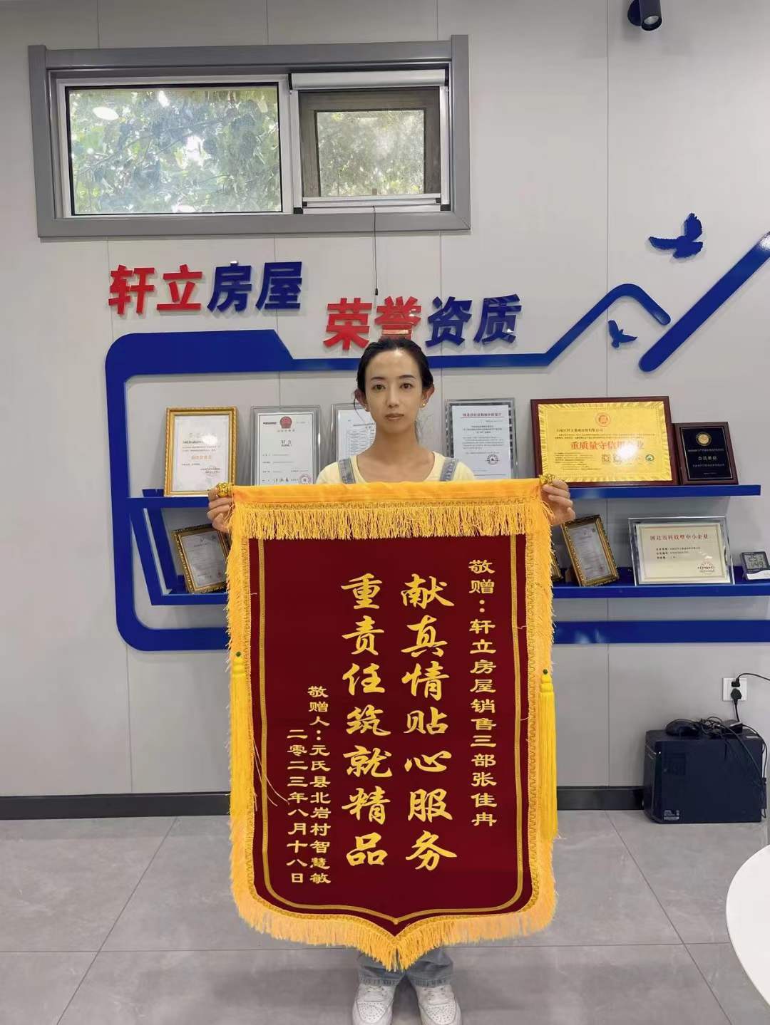 8月21号轩立业务经理张佳冉收到了来自石家庄市元氏县北岩村业主智慧敏先生送来的致谢锦旗,表达了业主对业务经理张佳冉工作态度和优质服务的肯定和感谢。