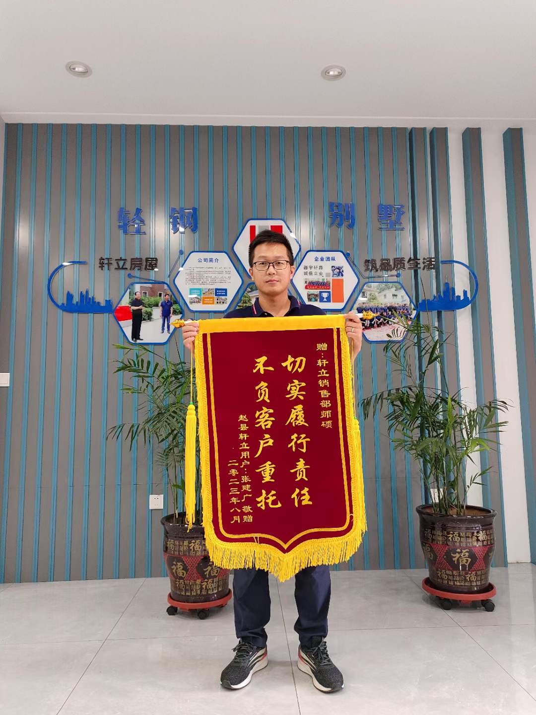 荣誉从无意外,收获匹配耕耘。一面锦旗的故事,打开生活美好的开端,这份由匠心抒写的独家记忆串联起业主与轩立的情感,也正是有千千万万像业主张建广先生这样的客户对轩立大力支持与信任,成就了轩立前行的动力,我们也必将这种精神传承,用心服务好每一位业主,用心施工好每一栋轻钢别墅,不负每位业主对轩立的信任。