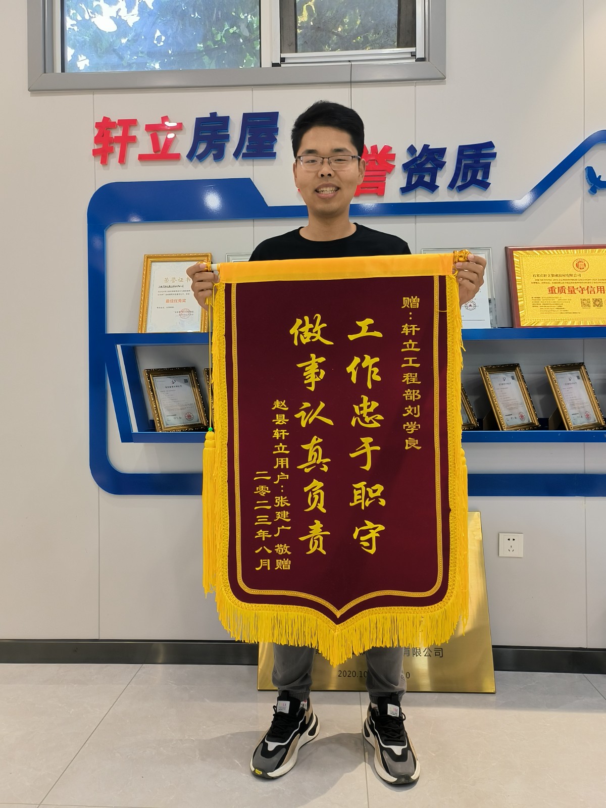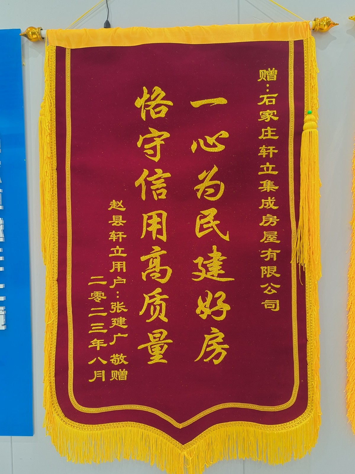 8月28日,对于轩立来说又是一个特殊的日子。今天,轩立收到了来自石家庄赵县前大章乡后大章村业主张建广先生赠送的三面锦旗,给予“一心为民建好房,恪守信用高质量”“工作忠于职守,做事认真负责”“切实履行责任,不负客户重托”的高度评价,是对业务经理师硕、项目经理刘学良工作认真负责的高度赞扬,也是业主张先生对石家庄轩立集成房屋有限公司的匠心品质的信任与肯定,以及对我们所有员工的一份认可与鼓励。